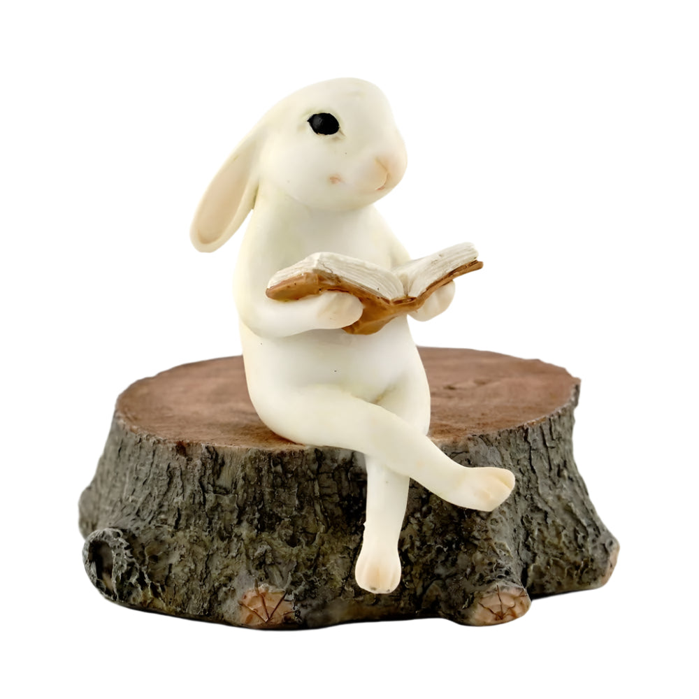 This little bunny is a sitting on a tree stump, engrossed in a book! It is 2.25" tall and 2.5" wide. This is a perfect gift for any bookworm, bunny lover, or as an adorable addition to a fairy garden!