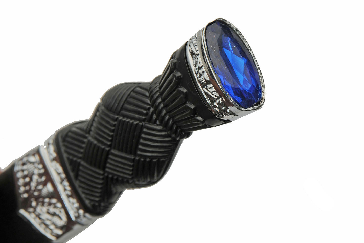 - Black sheath and blue gem on the end.