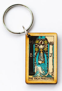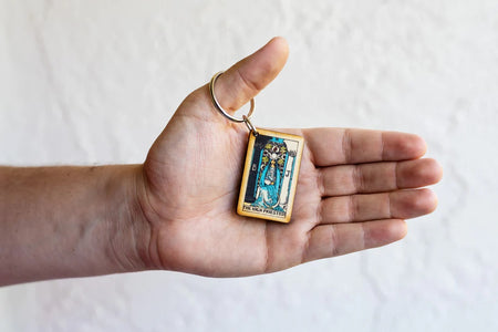 Full colour, hand painted tarot keychain, laser cut from 1/4" Baltic Birch ply wood, on a 33mm round keyring. Depicts a card from the classic Rider Waite Major Arcana.