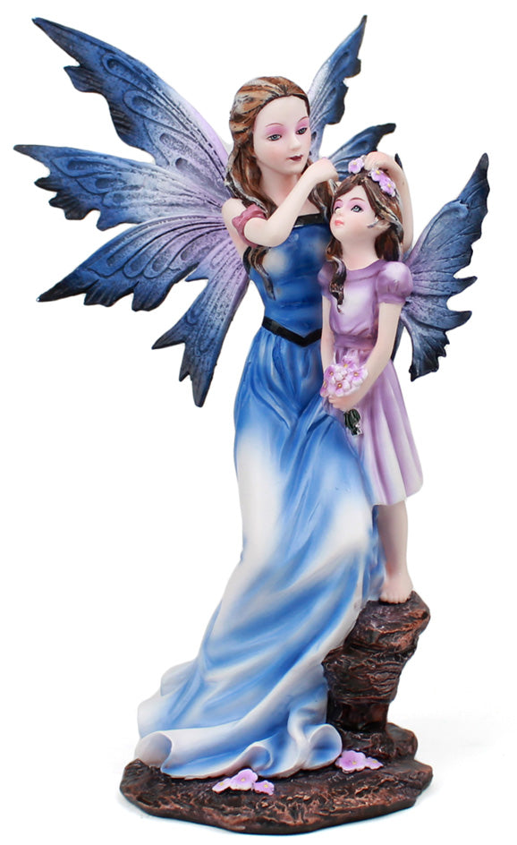 This sweet mother and child fairy duo is perfect for mom or any fairy lover! The mother fairy gingerly weaves a garland of flowers into her child's hair, a moment of tender familial love.