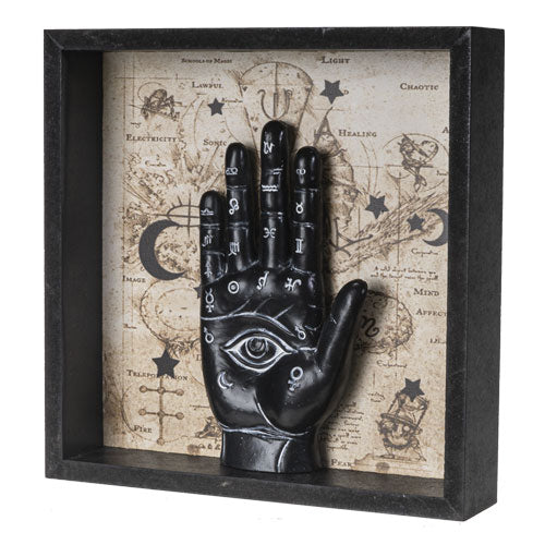 Fans of the art of chiromancy, or palm-reading, and the occult will delight in this unique, 3D plaque. The wooden frame holds a black palm inscribed with the astrological aspects of the palm, and an all-seeing-eye at its center. The backdrop features celestial designs to add to the mystical motif.