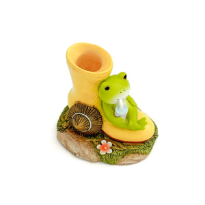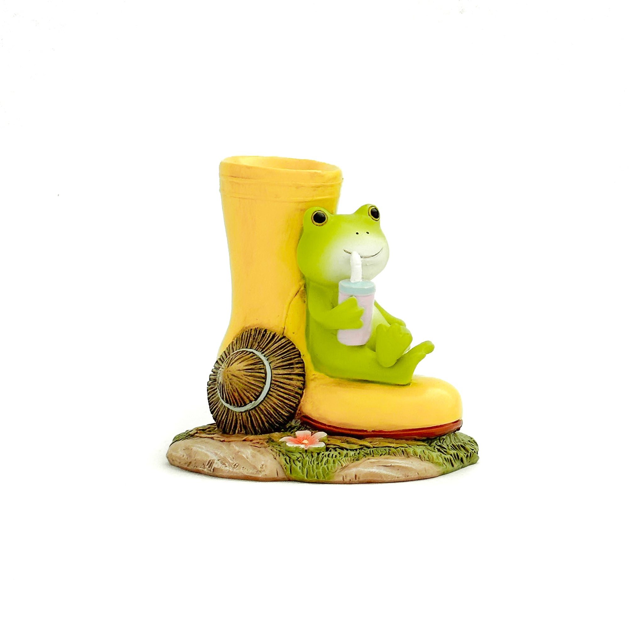 This tiny frog takes a break on a rain boot, sipping on a tasty drink! At 3" wide and 3" tall, this charming figurine makes a fun and unique present for both frog enthusiasts and miniature enthusiasts!