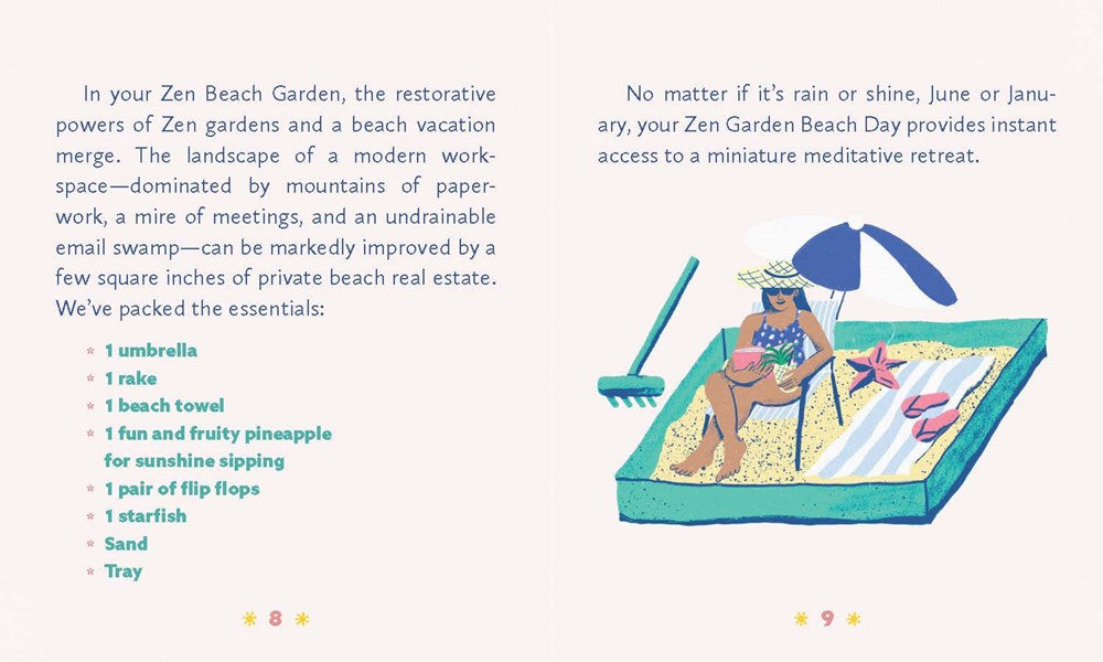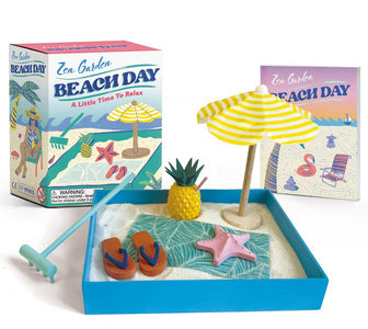 • 3 x 3-inch mini zen gardening tray, bag of sand, wooden rake, and miniature accessories (umbrella, starfish, towel, flip flops, tropical beverage)